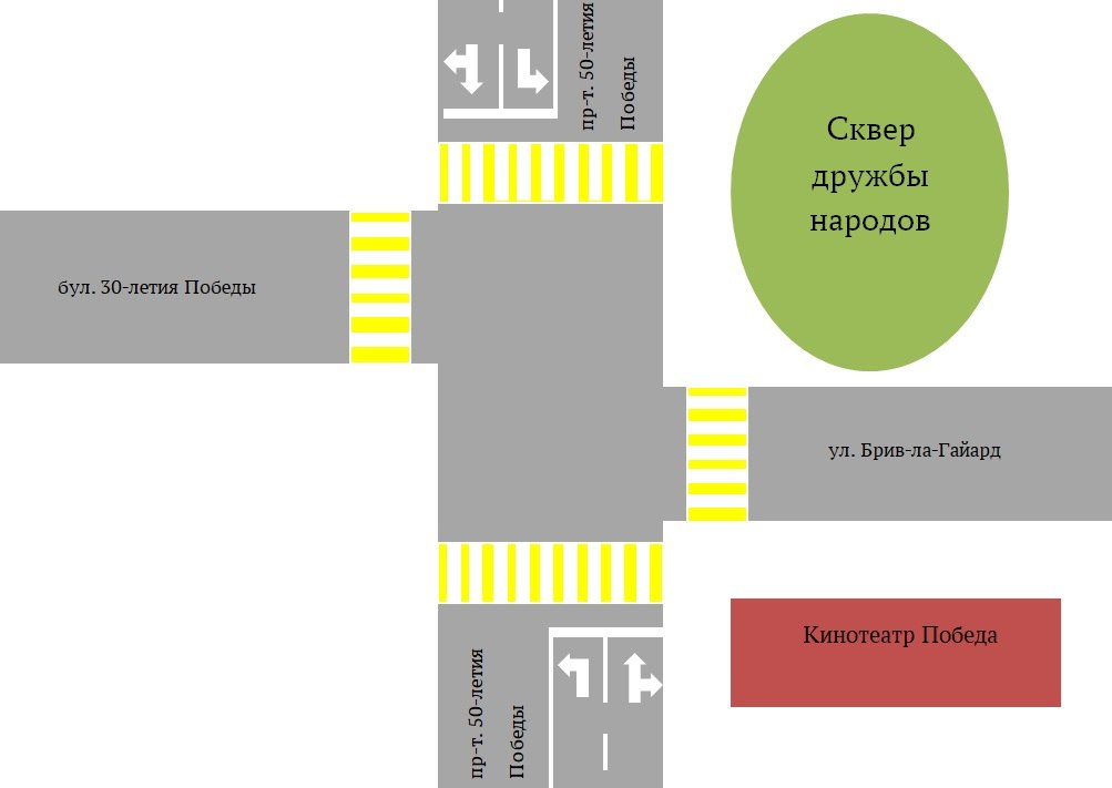 Дополнительные светофорные объекты будут установлены на проспекте 50-летия Победы, для беспрепятственного поворота налево в направлении бульвара 30-летия Победы и улицы Брив-ла-Гайард. также будет изменена горизонтальная дорожная разметка.