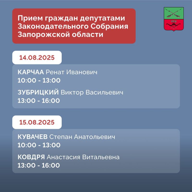 Жители Запорожской области могут обратиться к депутатам Законодательного Собрания Запорожской области и Мелитопольского городского Совета в ходе депутатских приемов.