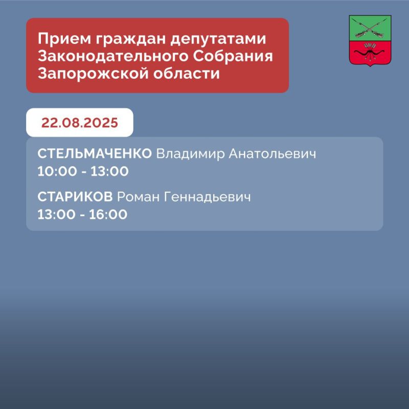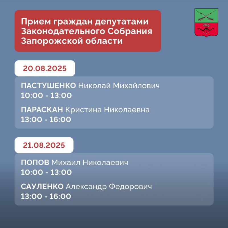 Жители Запорожской области могут обратиться к депутатам Законодательного Собрания Запорожской области и Мелитопольского городского Совета в ходе депутатских приемов.