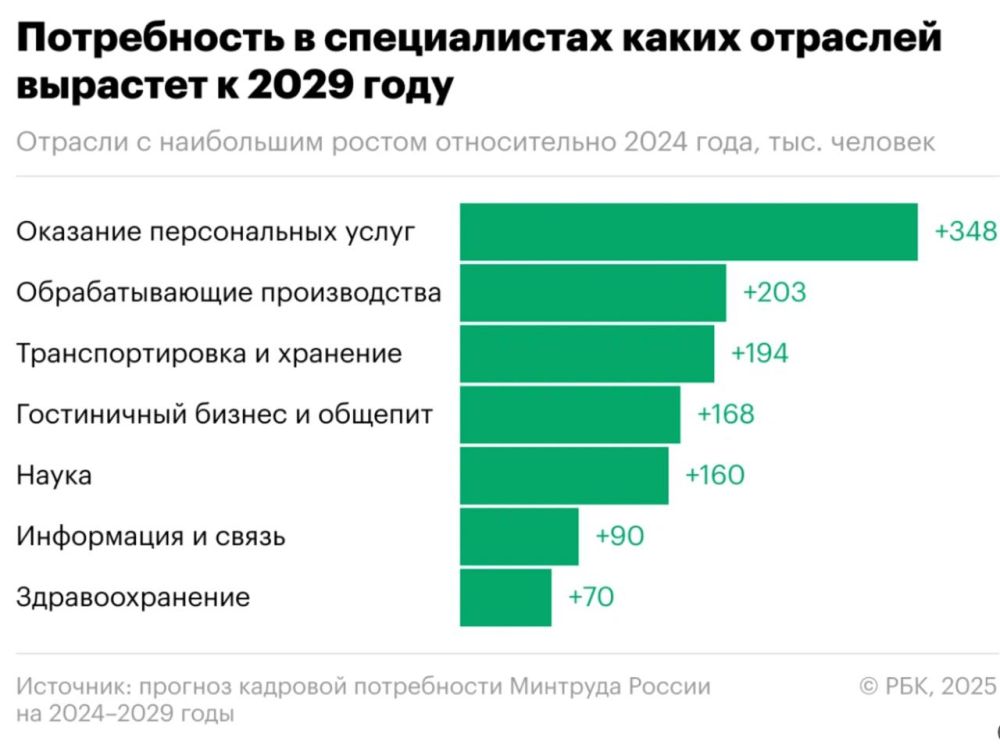 К 2029 году наибольший рост ожидают отрасли по оказанию персональных услуг, обрабатывающее производство, транспортировка и хранение, гостиничный бизнес и общепит, наука, информация и связь, а также здравоохранение. Это следует из прогноза кадровой потребности на 2024–2029 годы, разработанного Минтрудом.
