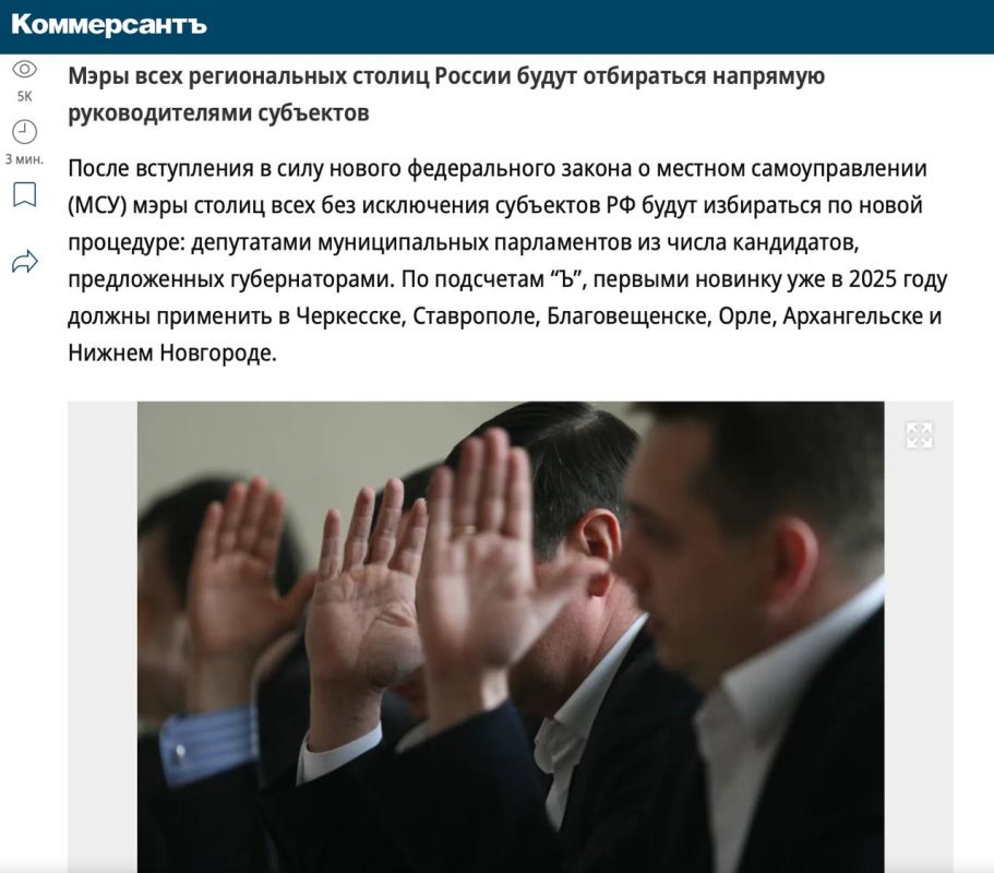 Мэры всех региональных столиц России будут отбираться напрямую руководителями субъектов