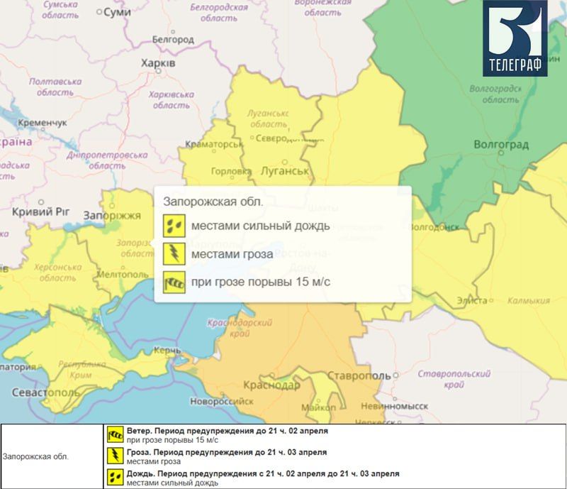 По информации Северо-Кавказского управления по гидрометеорологии и мониторингу окружающей среды, с 21:00 2 апреля до 21:00 3 апреля в Запорожской области ожидается: