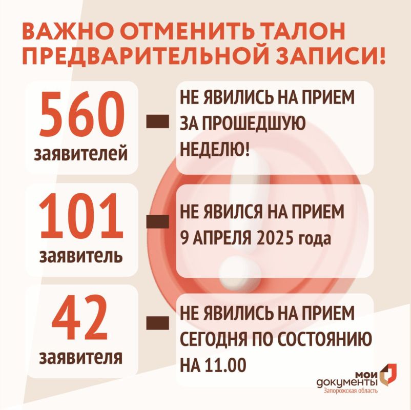 За прошедшую неделю в центры и офисы «Мои Документы» Запорожской области не явились на прием в выбранные время и дату 560 заявителей.