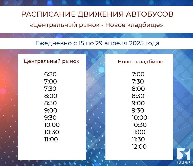 С 15 по 29 апреля движение автобусов «Центральный рынок - Новое кладбище» будет ежедневным.