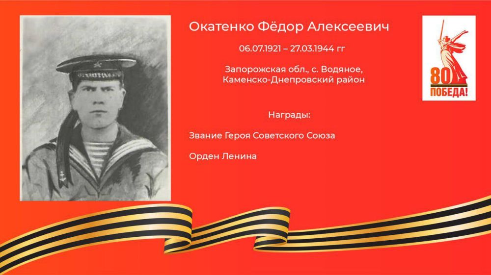 Фёдор Алексеевич Окатенко (06.07.1921 - 27.03.1944 гг) - матрос, стрелок 384-го отдельного батальона морской пехоты, герой легендарного "десанта Ольшанского". 27 марта 1944 года он пал смертью храбрых в боях за освобождение Николаева.