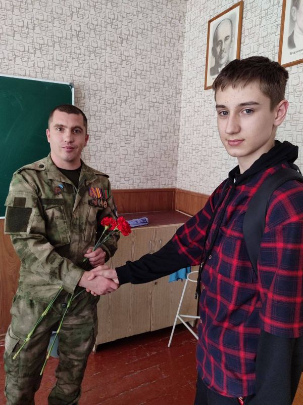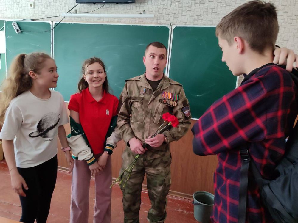 С почётной миссией учеников школы посетил член Ассоциации ветеранов СВО Запорожской области - Остапенко Александр Сергеевич, который поделился своими воспоминаниями и опытом. Его рассказ о мужестве и стойкости вдохновил ребят и помог лучше понять значение этого великого праздника.