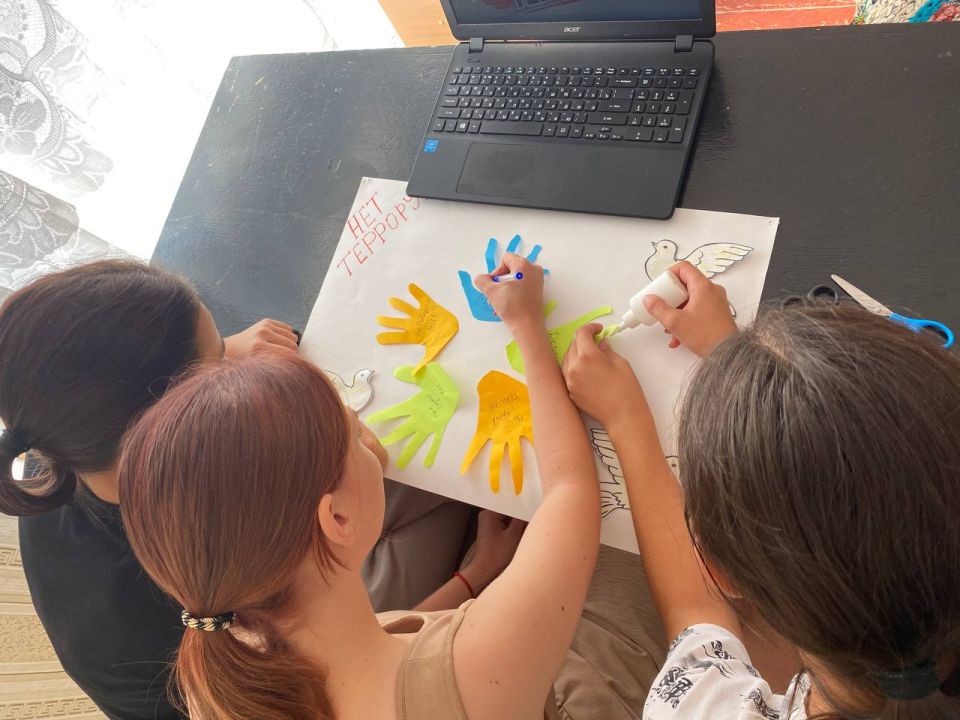 Участники просмотрели видеоролик и совместно создали яркий плакат «Мы — против террора!», выразив свою позицию за мир и безопасность.