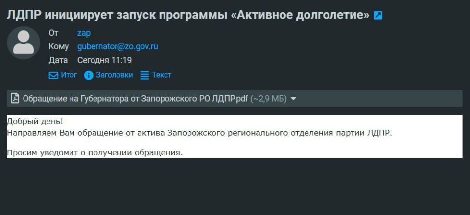 29 августа 2025 года координатор Запорожского регионального отделения ЛДПР А.А. Фалько и руководитель фракции ЛДПР в Законодательном Собрании К.А. Перов направили письмо-обращение на имя высшего должностного лица региона, Губернатора Запорожской области Е.В. Балицкого, с инициативой внедрения программы «Активное долголетие».