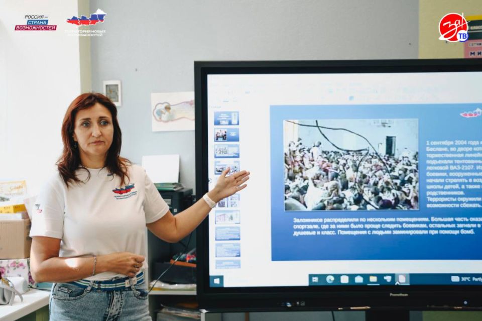 Свои впечатления на уроке выразила и ученица Таня, побывавшая летом на месте событий в Беслане. Эмоции, связанные с воспоминаниями о трагедии, тронули многих детей.