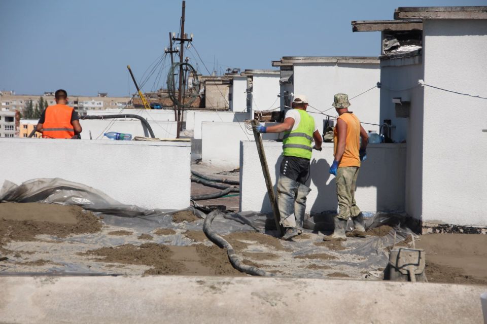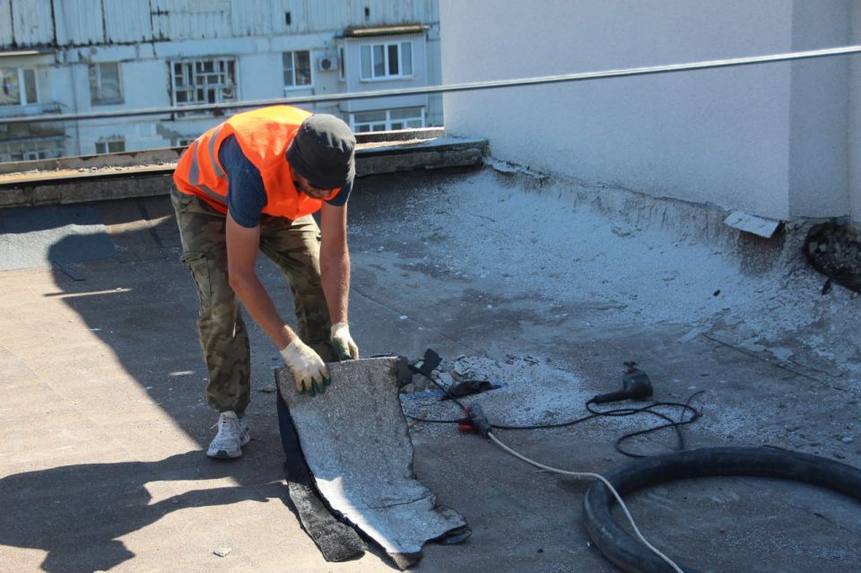 Ремонт кровли включает в себя демонтаж старого покрытия, восстановление вентиляционных каналов, шахт лифтов, парапетов, стяжки для беспрепятственного стока воды, а также замену наплавляемого кровельного материала.