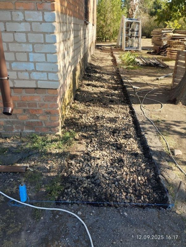 Сейчас подрядчики от шефов приступили к обустройству отмостки вокруг здания — для этого сделали подготовку из гравия. Отмостка обеспечит защиту фундамента от влаги и защищает грунт от намокания.