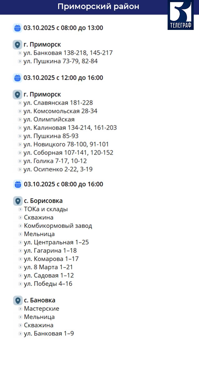 «Запорожьеэнерго» информирует о том, что в связи с проведением ремонтных работ будет отсутствовать электроэнергия в таких районах: