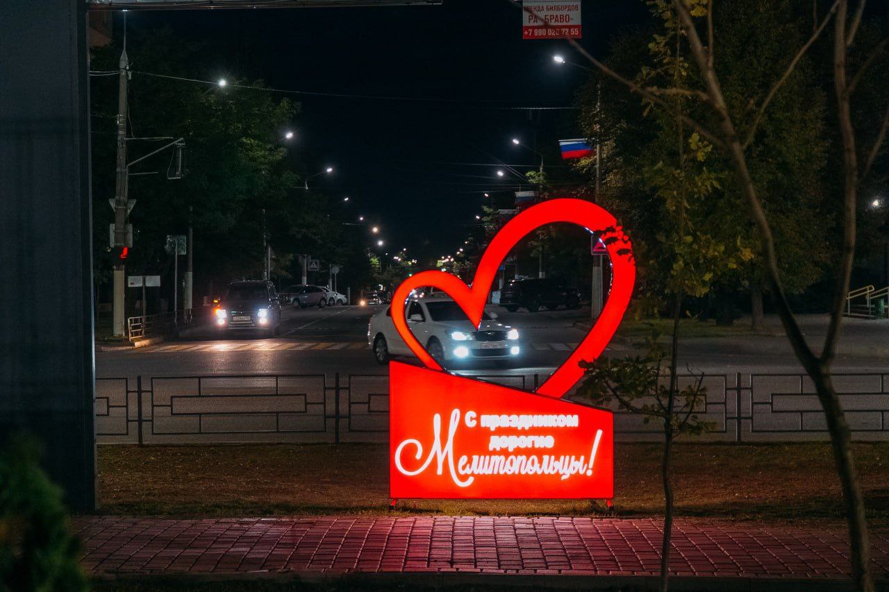 В Мелитополе появились тематические инсталляции с надписями "С праздником, дорогие мелитопольцы!" и "С праздником, любимый Мелитополь!".