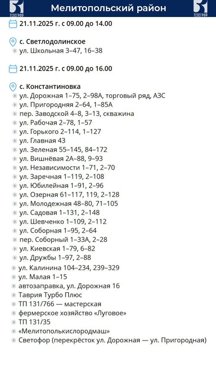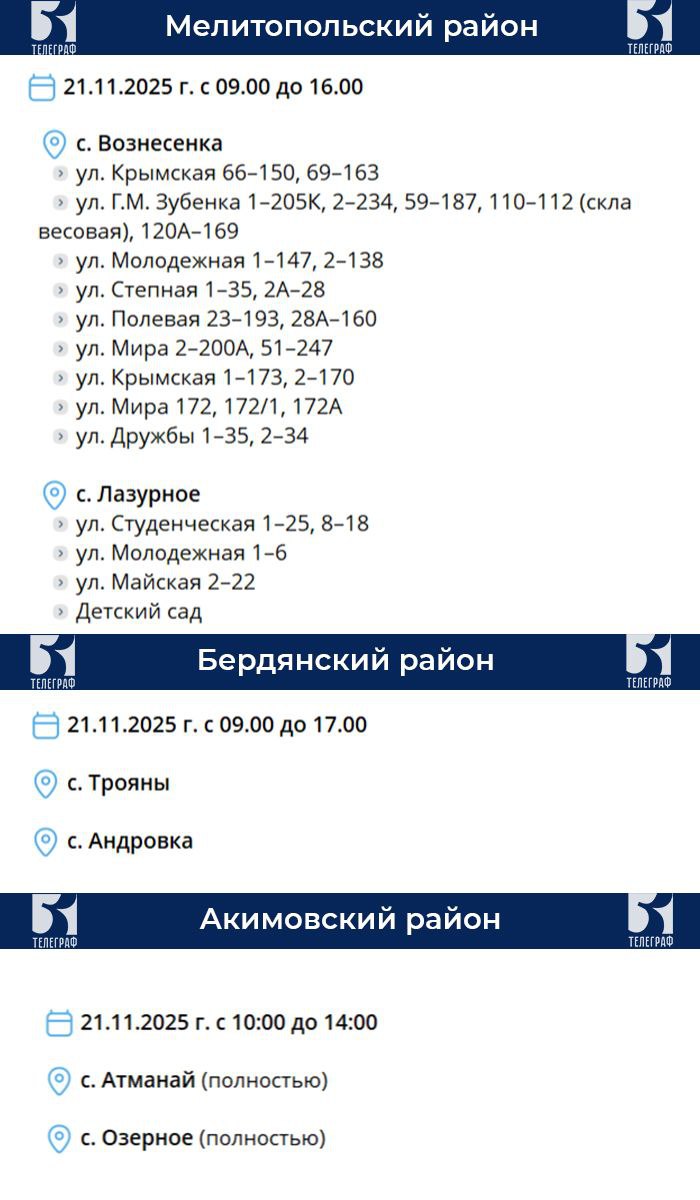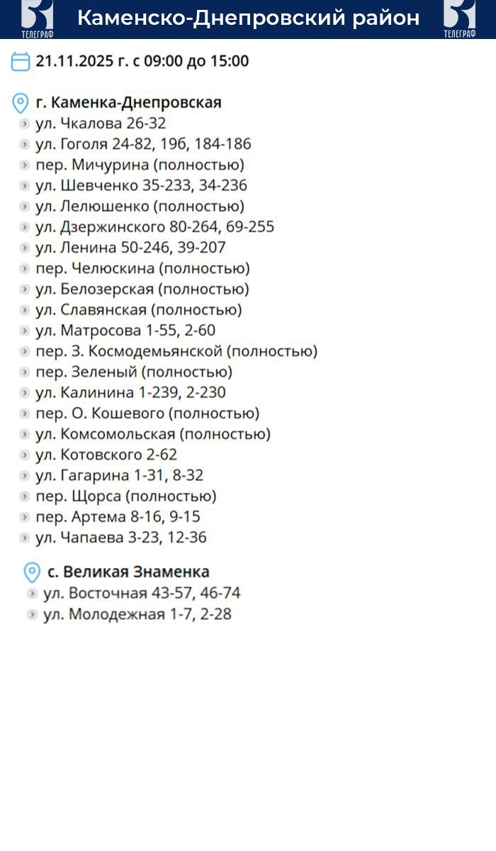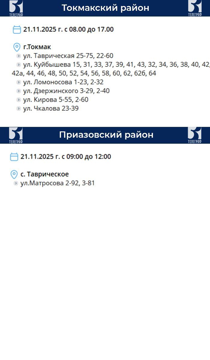 «Запорожьеэнерго» информирует о том, что в связи с проведением ремонтных работ будет отсутствовать электроэнергия в таких районах: