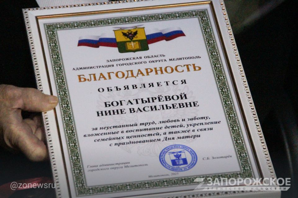 «В рамках торжественной части от главы администрации городского округа Мелитополь мы вручили благодарности мамам, которые внесли особый вклад в воспитание своих детей, вырастили достойную смену. Эти дети будут прекрасным примером для тех, кто стремится к чему-то хорошему», — отметила исполняющая обязанности председателя Мелитопольского городского совета депутатов Ирина Матвиенко.