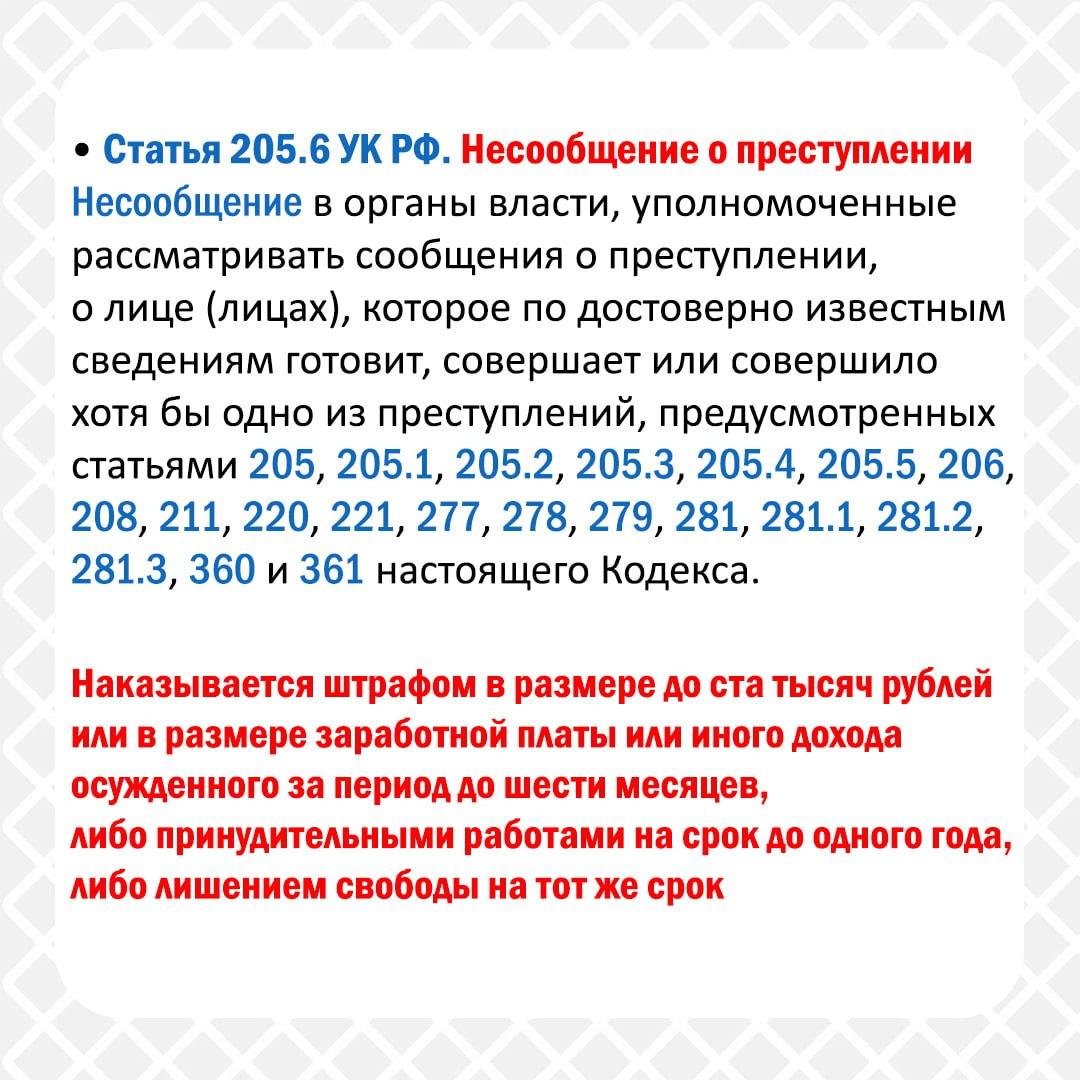 Если вам стало известно о финансировании терроризма или других действиях, направленных на подрыв стабильности работы государственных органов, социальных служб или других структур, немедленно сообщите об этом!