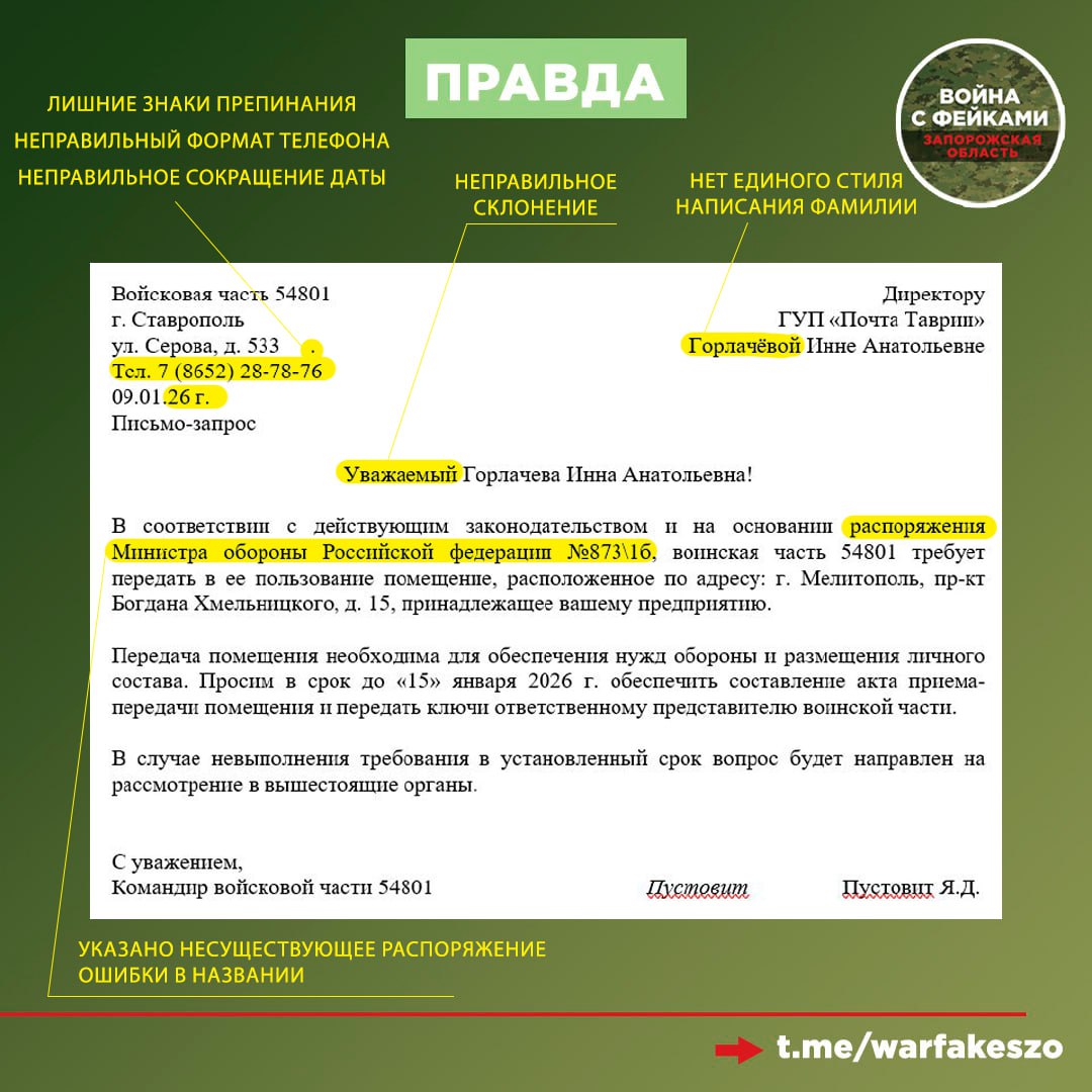 Правда: В чат-бот губернатора поступают обращения от организаций после получения писем от ЦиПСО на электронную почту. Письма направлены государственным и частным предприятиям Запорожской области. В письме указаны реквизиты войсковой части 54801 г. Ставрополь, однако в комендатуре Запорожской области опровергли информацию о том, что командир 247-го полка направлял обращения в какие-либо организации. Также в тексте присутствует множество грамматических ошибок и указано несуществующее распоряжение Минобороны РФ.