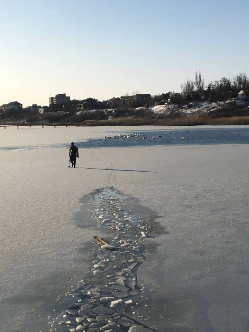 Вследствие морозной погоды на лимане установился прочный ледяной покров. Лебеди, которые давно облюбовали эти места, стали заложниками белой ловушки.