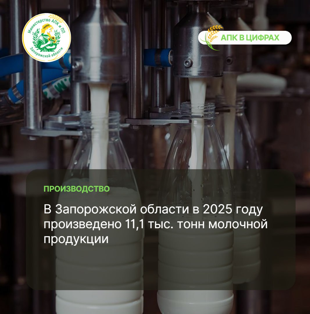 В 2025 году в Запорожской области произведено 11,1 тыс. тонн молочной продукции, включая сухое молоко, сыры, сливочное масло и другие изделия.
