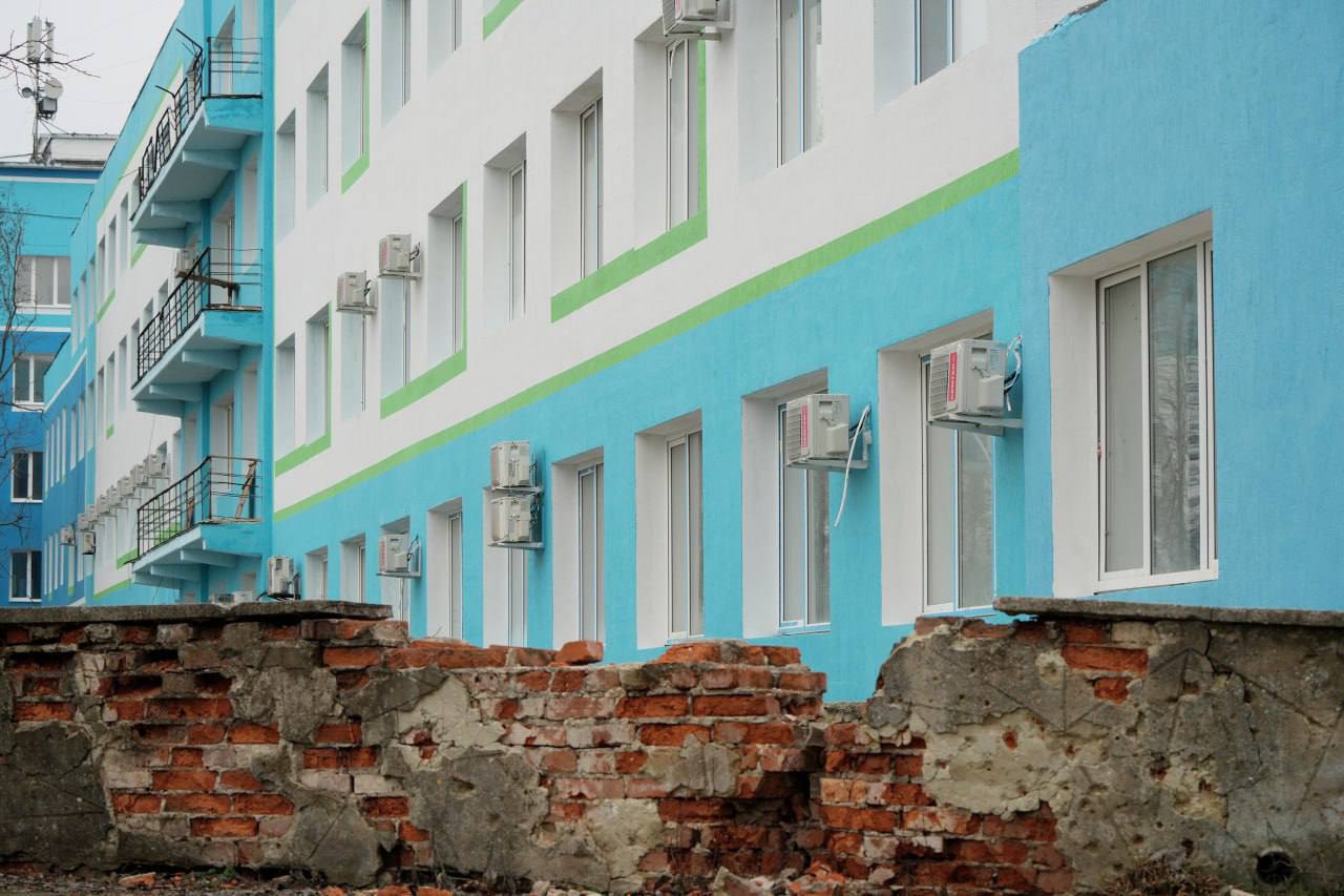 В Мариуполе завершается восстановление больницы Водников (на фото). В 2022 году через здание поликлиники №2 прошли боевые действия. Несмотря на разрушения, неповрежденные отделения больницы продолжили работу. К восстановительным работам приступили уже в 2023 году. В настоящее время завершены фасадные работы на здании отделения первичной специализированной медико-санитарной помощи №2;