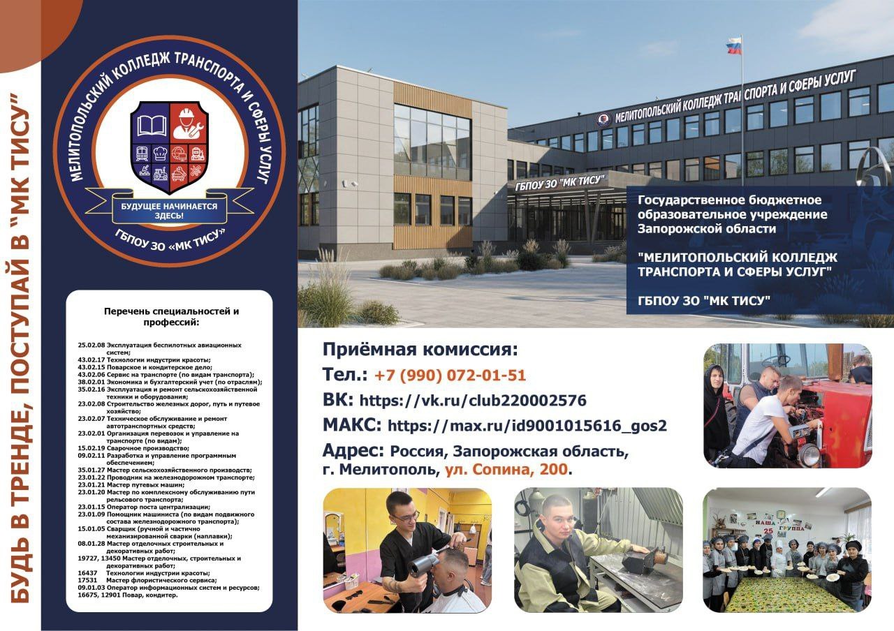 ГБПОУ «Мелитопольский колледж транспорта и сферы услуг» приглашает школьников, выпускников и их родителей на День открытых дверей (в очном формате).