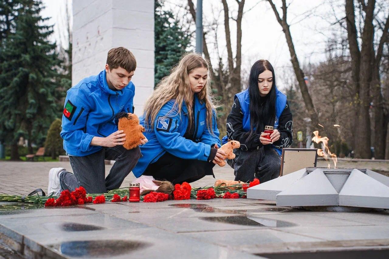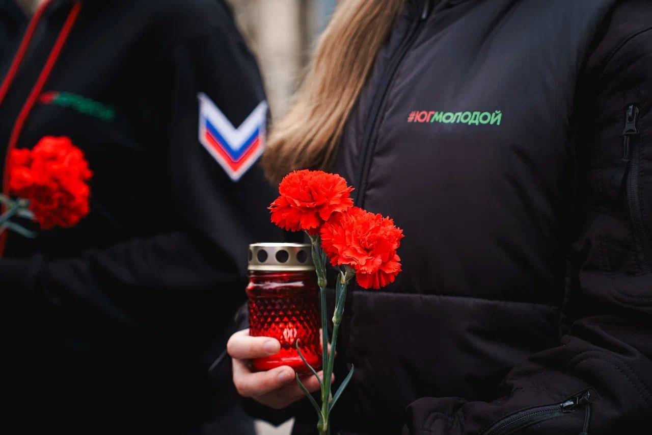 Активисты межрегионального молодежного движения «Юг Молодой» совместно с волонтерами регионального штаба #МЫВМЕСТЕ и активистами «Волонтёры Победы» возложили цветы к Вечному огню на мемориальном комплексе «Братское кладбище» и почтили память погибших минутой молчания.