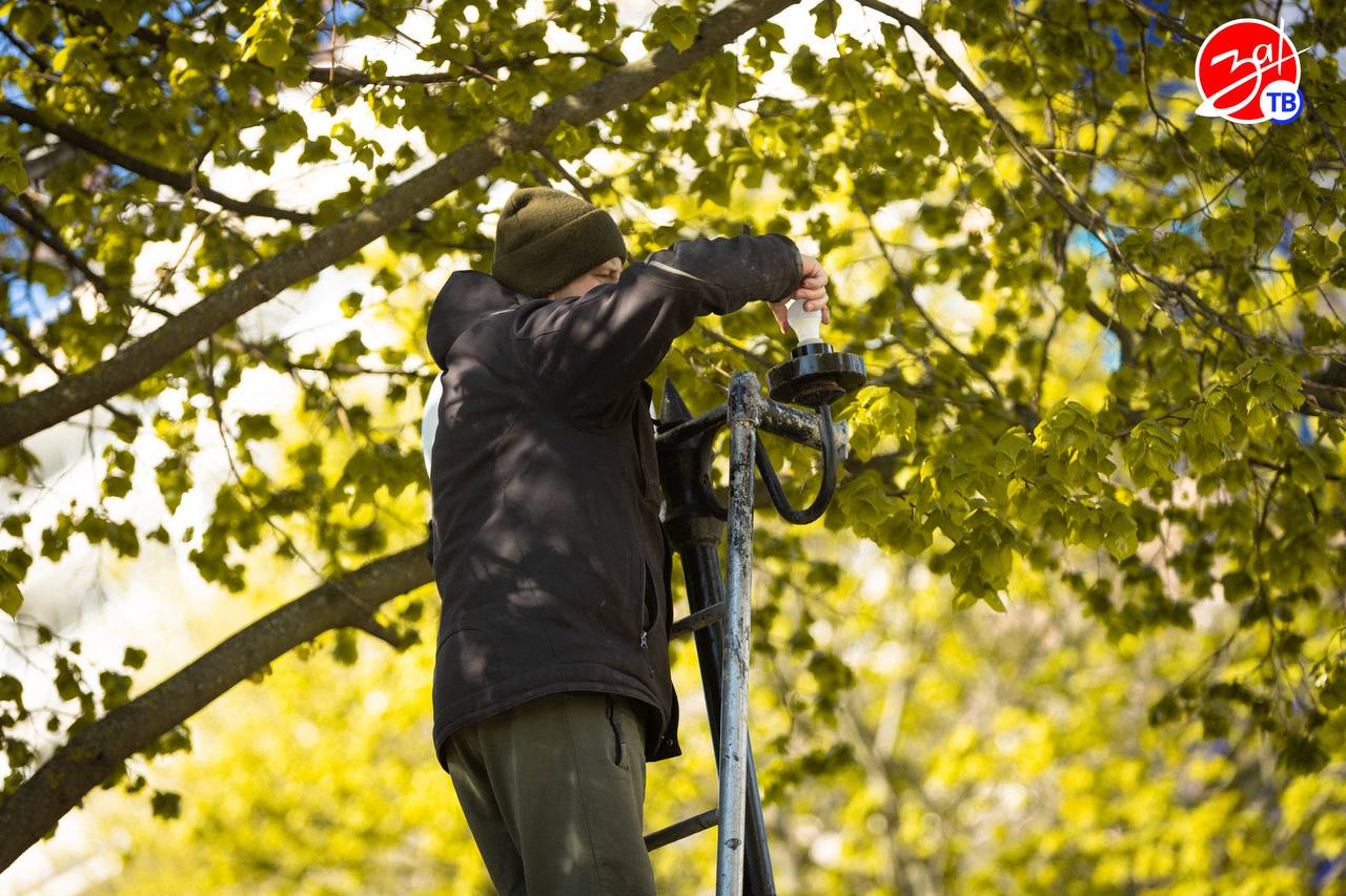 Сотрудники «Горсвета» вымыли светильники на аллее Славы в Мелитополе и проверили их работоспособность.