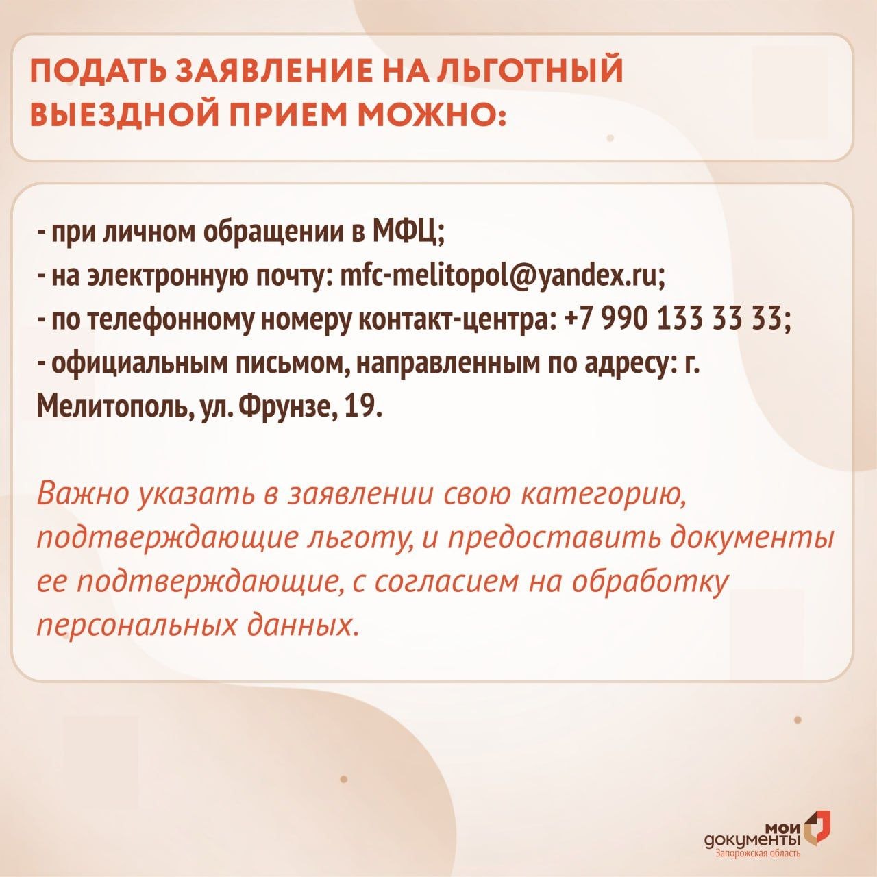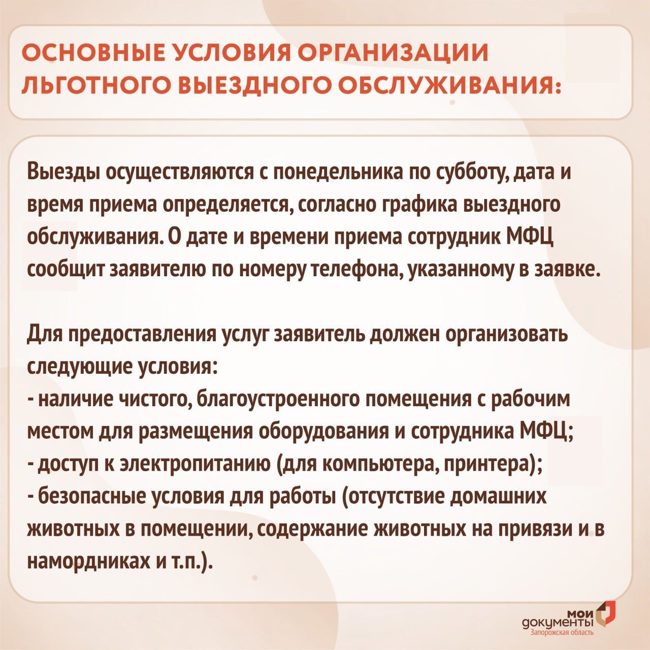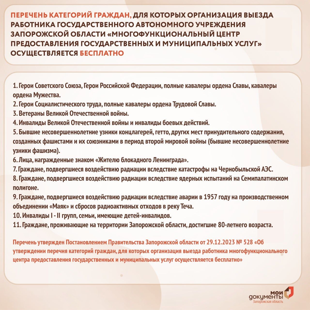 Жители Запорожской области, относящиеся к льготной категории граждан, могут обратиться в МФЦ Запорожской области с заявлением на бесплатный выездной приём для получения государственных услуг и выдачи готовых документов.