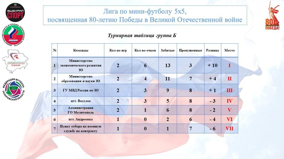 20 сентября в городе Мелитополь прошел 2-й игровой день группового этапа Лиги по мини-футболу 5х5, посвященной 80-летию Победы в Великой Отечественной войне.