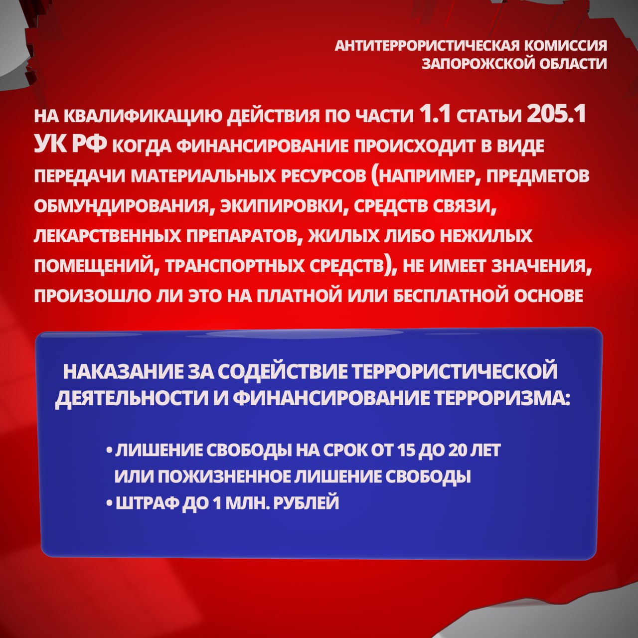Антитеррористическая комиссия Запорожской области напоминает, что финансирование террористической деятельности — это серьёзное уголовное преступление и угроза безопасности каждого из нас.